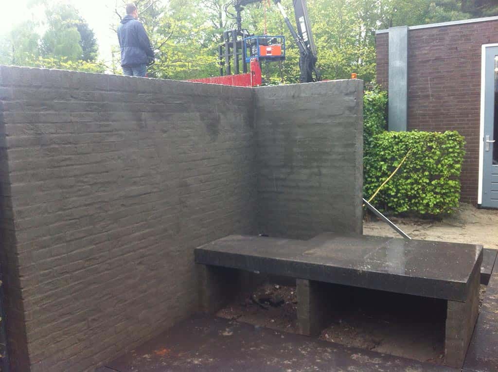 Op de fundering zijn de vijverwanden opgemetseld en de tuinmuur die voldoende privecy geeft en een onderdeel vormt van de tuin.